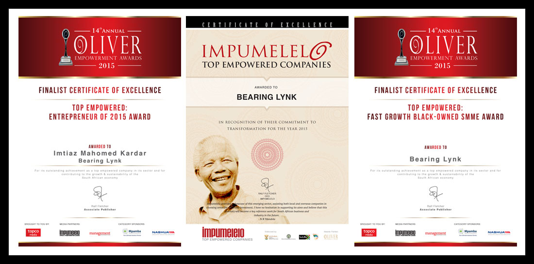We are showcased on the covers of leading engineering magazine – Impumelelo and have received a certificate of excellence for – Impumelelo Top Empowered Companies. We have also received received the following at the Oliver Awards 2015: